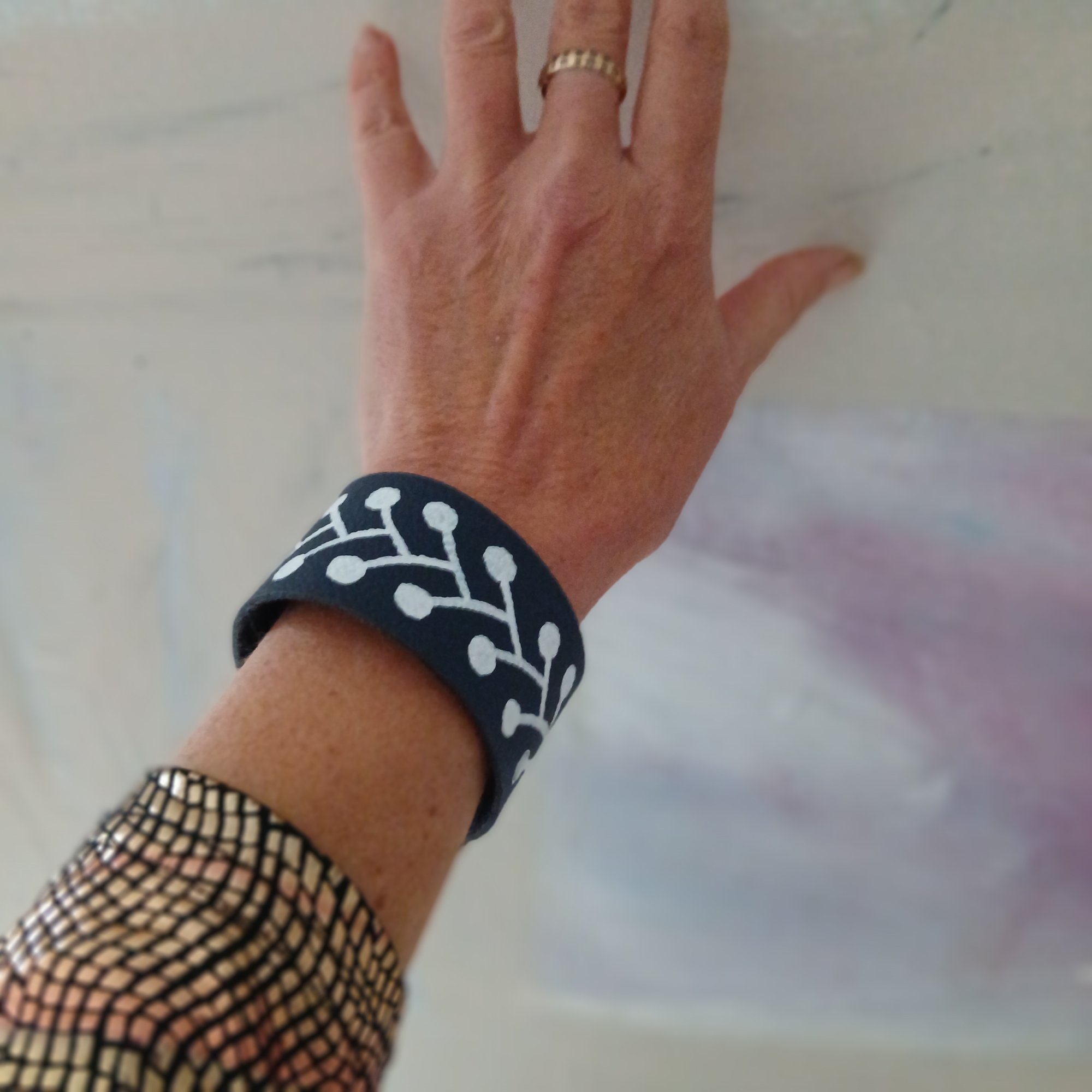 Hand painted leather cuff made in collaboration with Offkuttt.